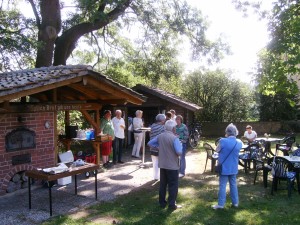Wir haben draußen gesessen, unter einem großen Walnussbaum. Wir haben eigentlich hatten wir mit rund 40 Personen gerechnet, bedauerlicherweise mussten ein paar Mitglieder absagen, weil es ihnen entweder gesundheitlich nicht gut ging, oder noch schlimmer, jemand im Krankenhaus liegt, oder im Urlaub waren. Alle Mitglieder hatten wir mit einem Brief noch einmal an den Geburtstag erinnert. Am Ende waren wir aber dennoch knapp 18 Personen. Trotzdem war es ein richtig schöner Tag, wir haben im Backofen, der auf dem Platz steht, einen Krustenbraten für unsere Mitglieder gehabt, und den Grill haben wir auch noch angeworfen. Somit haben wir richtig schön geschlemmt, jeder hatte etwas mitgebracht. Kuchen gab es auch, und der Nachtisch von der lieben Susanne ist auch nicht zu vergessen, der war einfach nur lecker!!!! Nach dem Essen hat sich ein Teil der Gruppe auf den Weg in die dort stehende Kirche gemacht, wo Detlef, unser Mitglied, der die Möglichkeit für die Feier organisiert hat, noch eine Kirchenführung gemacht hat. Wo erlebt so was schon, eine Führung durch eine Kirche, an einem Tag, wo die Sonne scheint und man etwas zu feiern hatte, richtig nur bei uns. An alle jene, die durch Krankheit verhindert waren, unsere Genesungswünsche. Für alle jene, die im Urlaub waren, vielleicht klappt es ja im nächsten Jahr und alle anderen, schade, dass ihr nicht da ward, ihr habt was verpasst. Wie die Bilder zeigen.