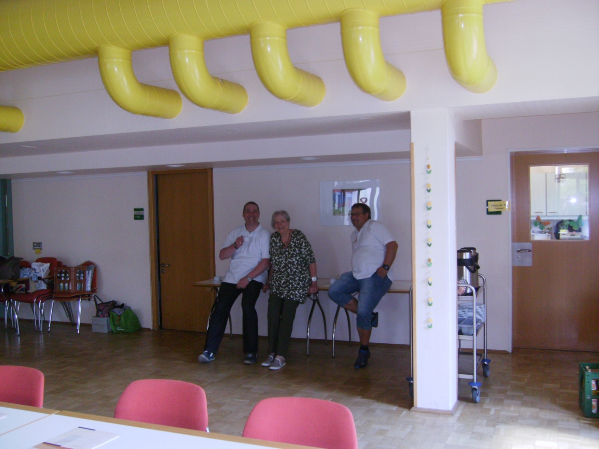 Das es etwas Großes wurde, kann man gut daran erkennen, dass wir nicht im Rosencafé die Veranstaltung hatten, sondern direkt gegenüber im großen Saal, der genügend Platz für ca. 40 Leute und mehr hat. Wir, das waren meine Frau Danny, Liane, unsere zweiter Gruppenvorsteher Timo, und meine Wenigkeit hatten die Zeit sinnvoll genutzt, und bauten schon mal Alles auf, also Tische und Stühle richtig stellen, die Bannerwand aufbauen, bevor wir dann endlich Zeit fanden, um einen Kaffee zu trinken. Hektischer wurde es dann wieder, als die ersten Gruppenmitglieder eintrafen, da war es dann vorbei, mit der Ruhe